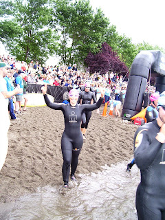 I need to start more in the middle next time! I was off to the far, far right and that worked at IMC, but this is a two lap course, so it seemed to take me forever to get to the first turn. I had to go on too much of an angle. I promise I have yet to use the Pythagorean Theorem to determine the hypotenuse of the triangle that I swam. I still might though - I'm curious just how much I swam. I'm sure it was about 4 km! So next time it's a straight line about mid pack. I will likely get bumped around a lot more, but I have to learn to take it sometime!